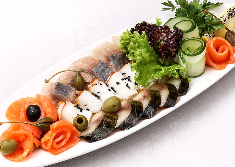 Рыбное ассорти лосось, скумбрия х/к, сельдь слабого посола, кальмар г/к, маслины, огурцы, каперсы, лимон, зелень 390 |
