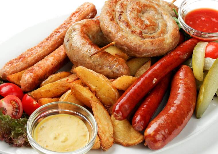 Горячее ассорти по-баварски колбаски: краинская с сыром, брюгерская, дебрецинская, купата братвурст; картофельные дольки; соусы горчичный и барбекю 1070 |