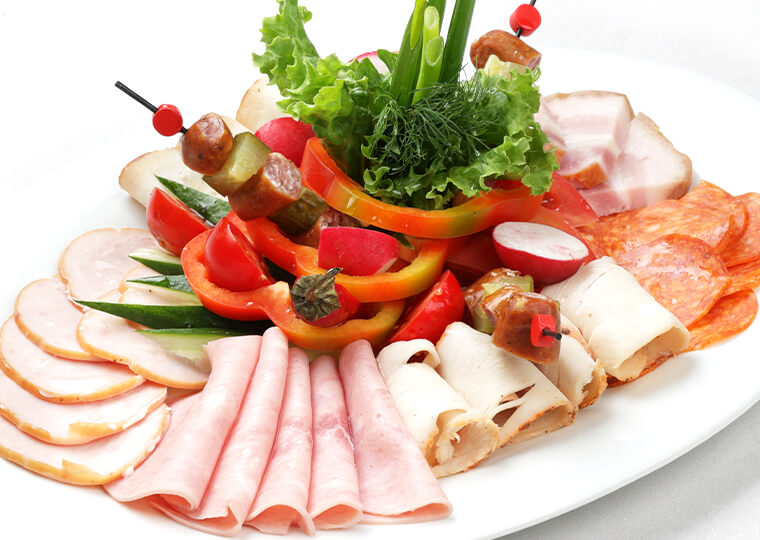 Мясное ассорти со свежими овощами карбонад, ветчина, салями, индейка, грудинка, рулет куриный, мини колбаски, перец болгарский, огурцы, помидоры, редис, зелень 550 |