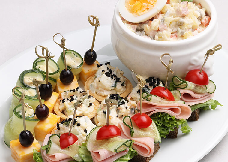 Салат оливье с закусками мраморный сыр с виноградом, тарталетки с крабовым салатом, рулетики из огурцов с сырной начинкой, канапе на тосте с салями, салат оливье 880 |
