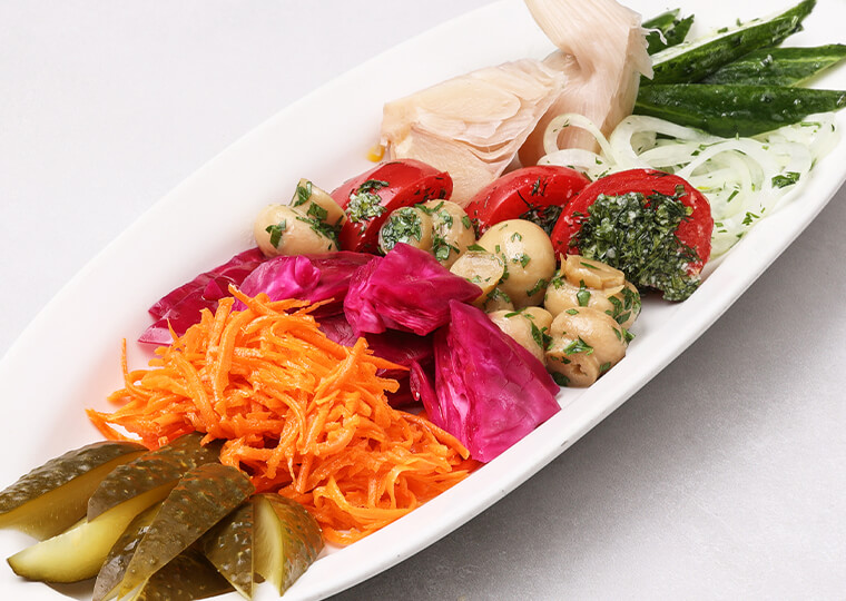 Разносолы малосольные огурчики, маринованные огурчики, морковь по-корейски, квашеная капуста по-грузински, маринованные шампиньоны, томаты домашнего посола, чеснок и маринованный лук 440 |